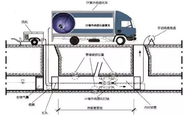 本公司主要采用紫外光固化法CIPP修復工藝,這種方法施工比較快,并且相對比較容易控制,可以通過連續記錄空氣壓力、內襯層溫度、紫外光發射及其光線強度與固化速度對整個固化過程進行控制和管理。